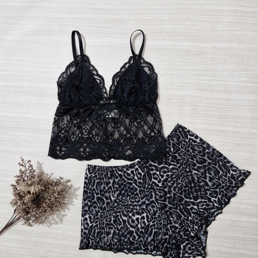 Camisola básica de liganete estampada e detalhes em renda sandia