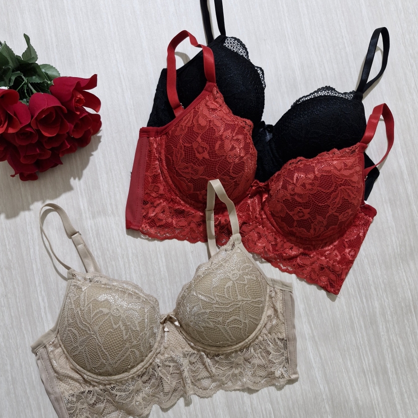 Conjunto de lingerie soutien rendado reforçado e calcinha normal em três cores