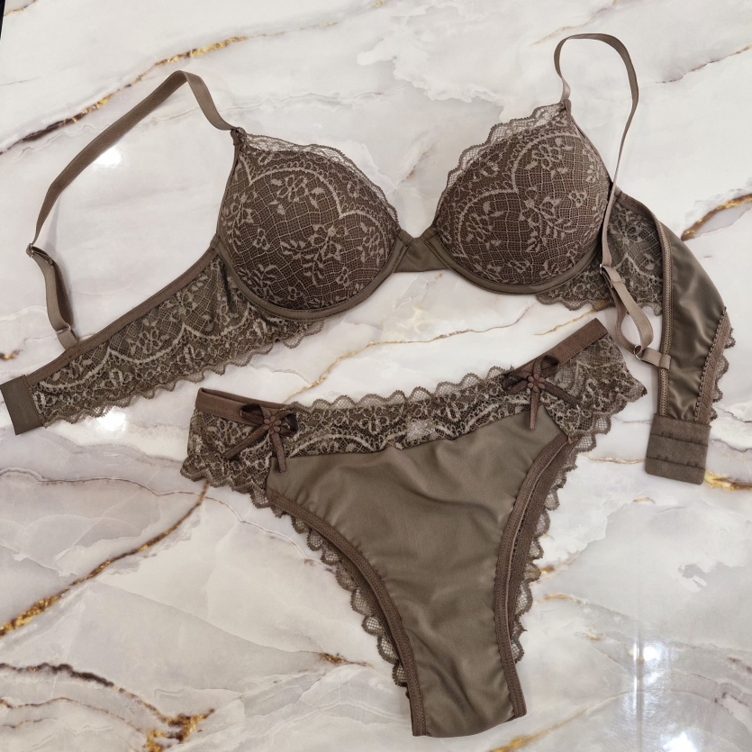 Conjunto de lingerie em renda marrom com soutien de bojo triângulo