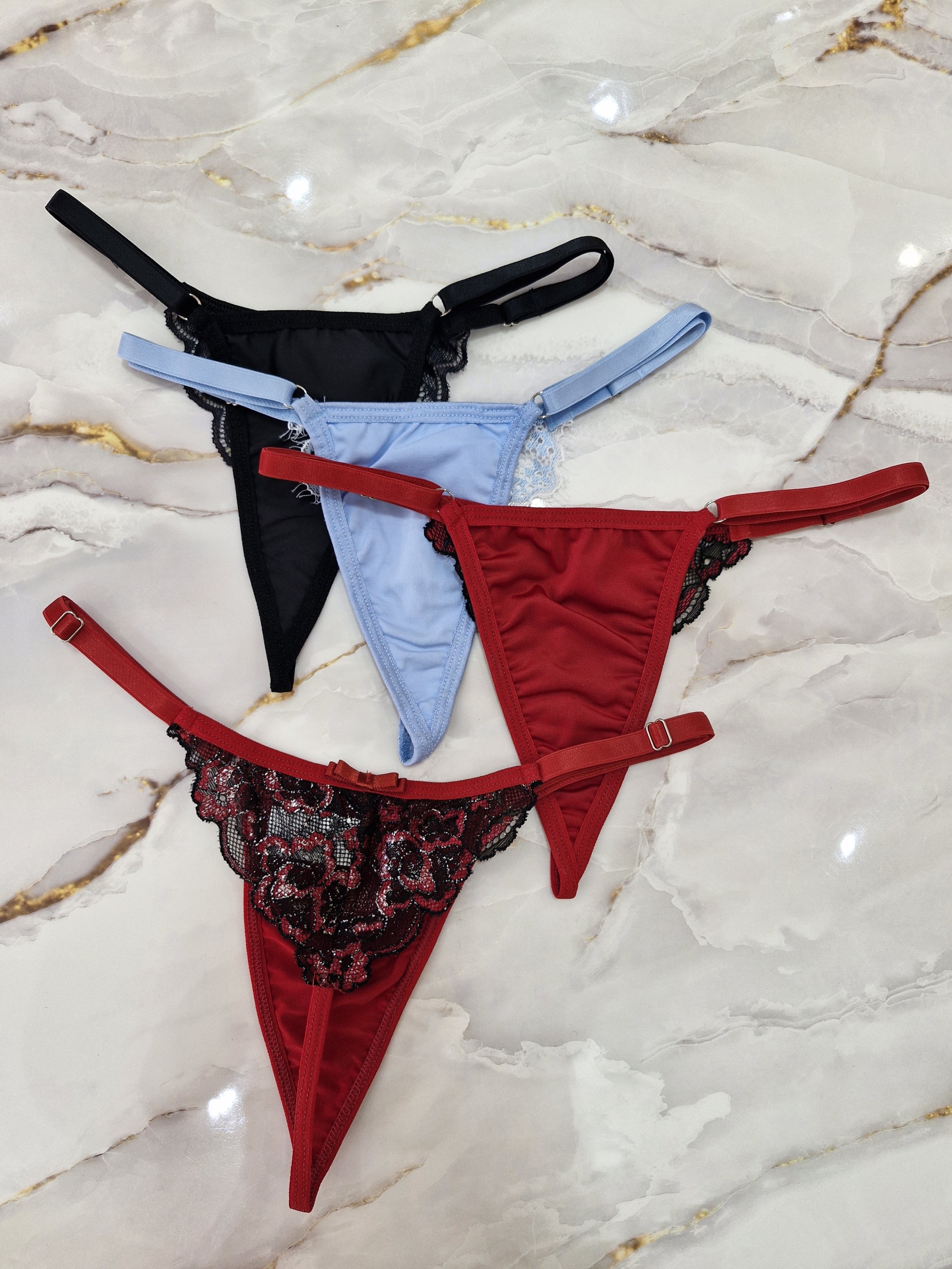 Calcinha fio-dental feita com poliamida, renda, tiras com regulagem e lacinho.