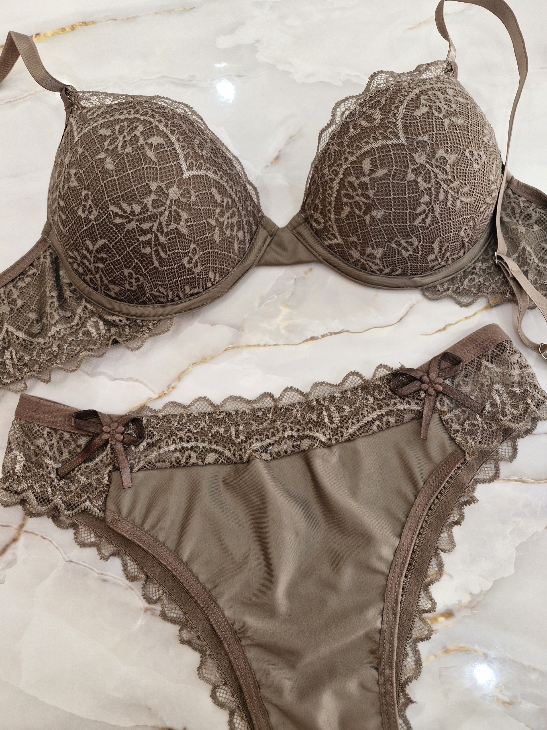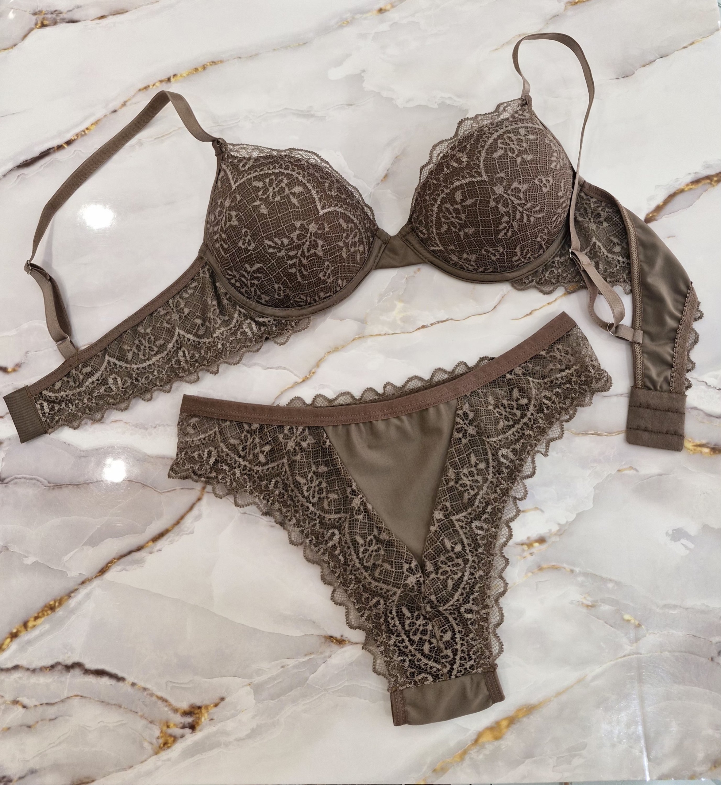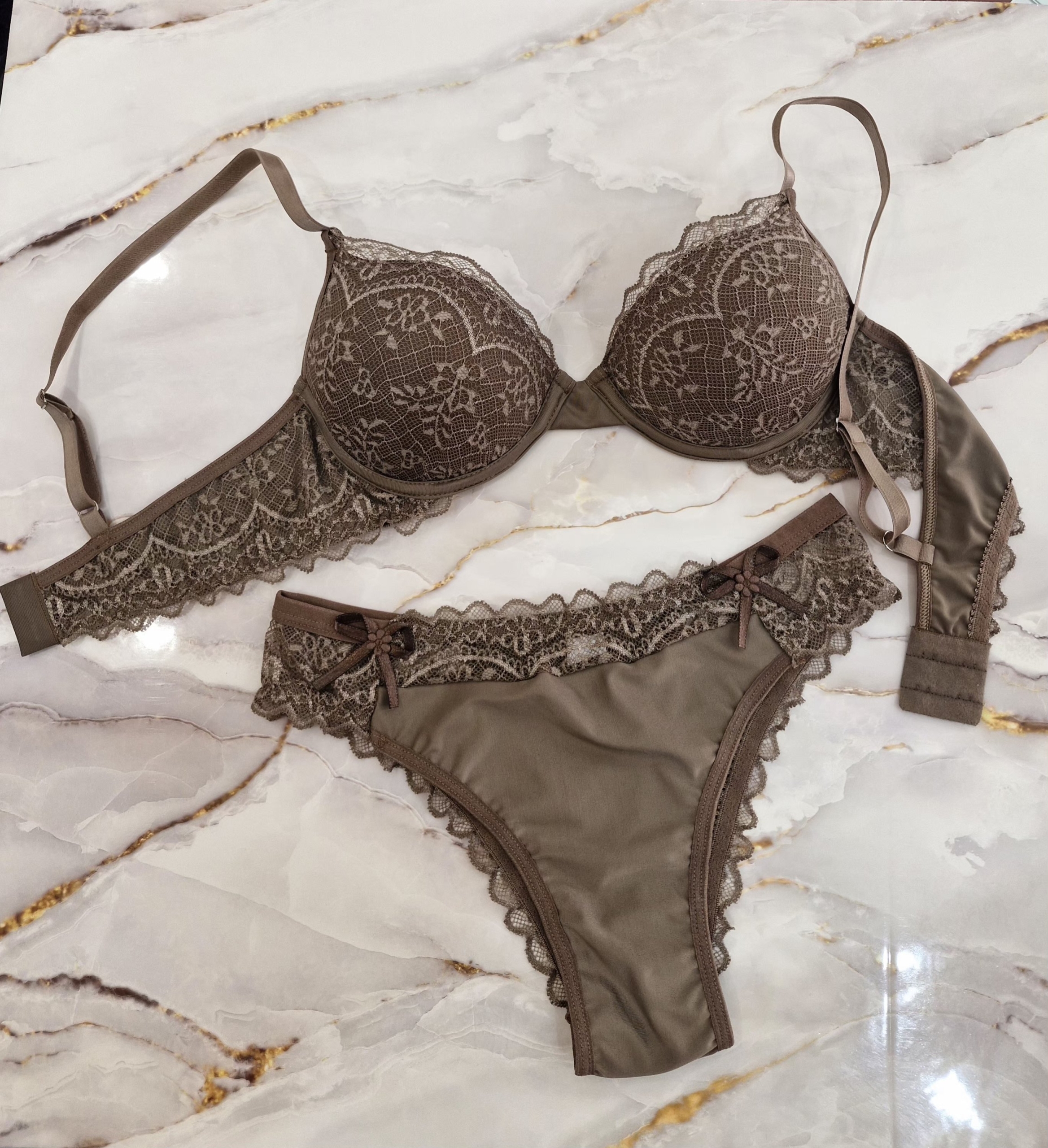 Conjunto de lingerie feito com bojo, renda, poliamida, alças ajustáveis, abotoador e viés.