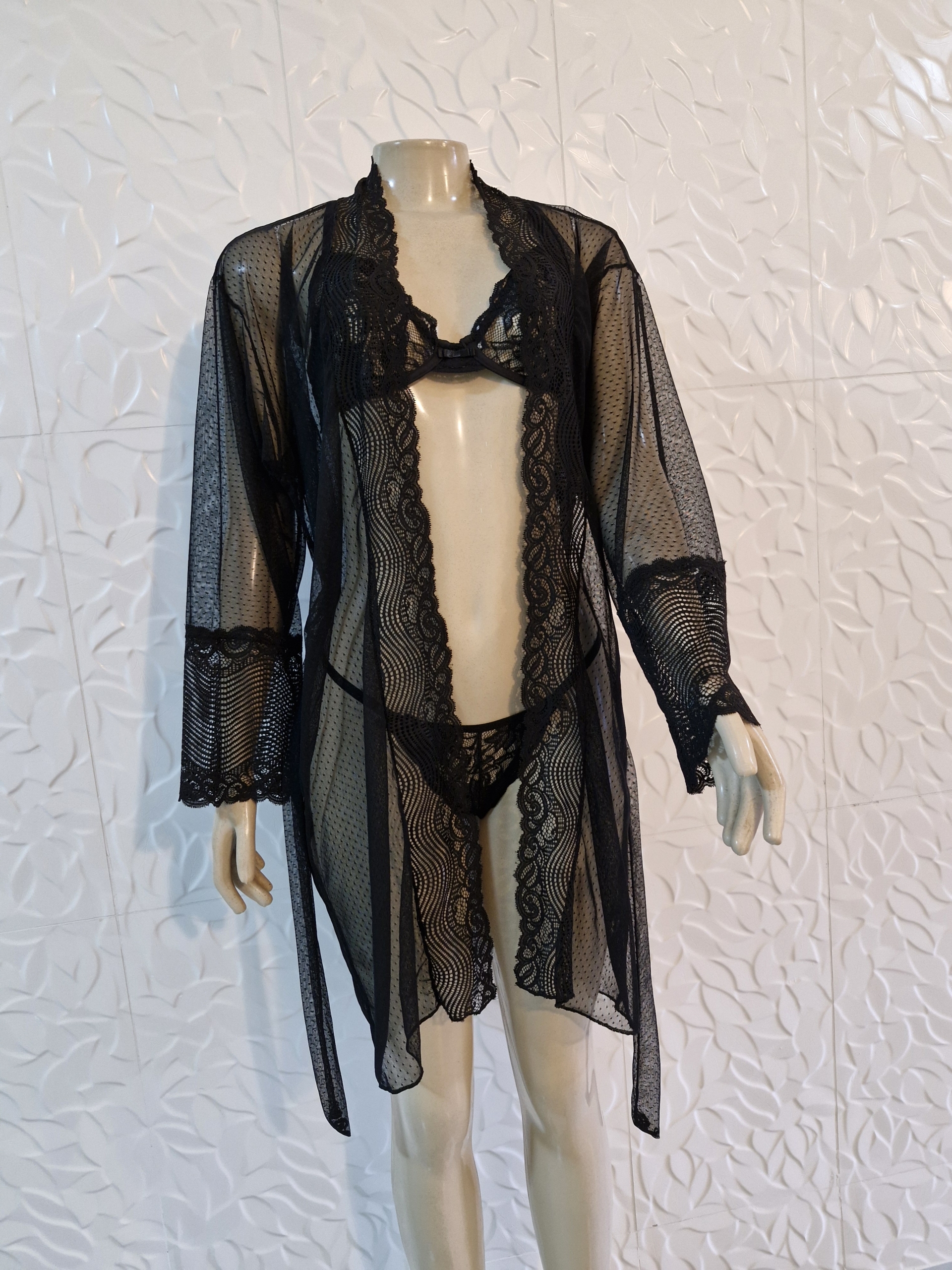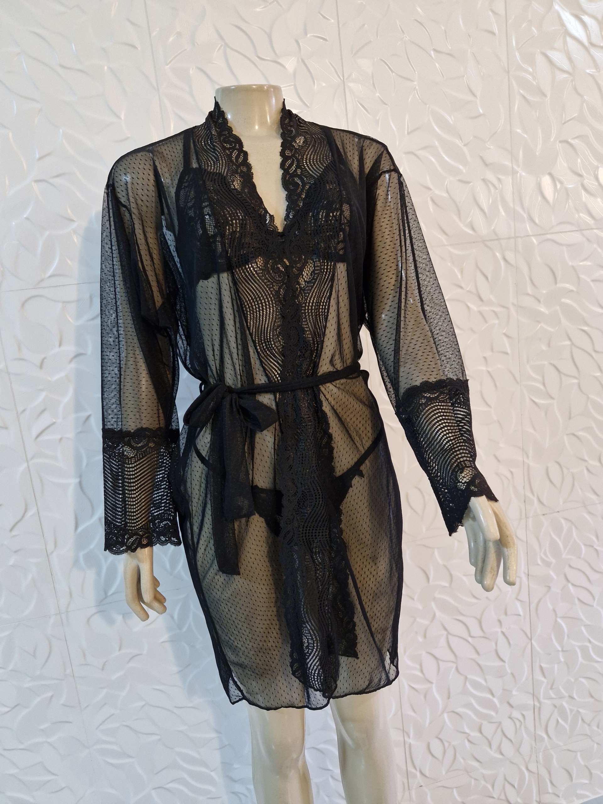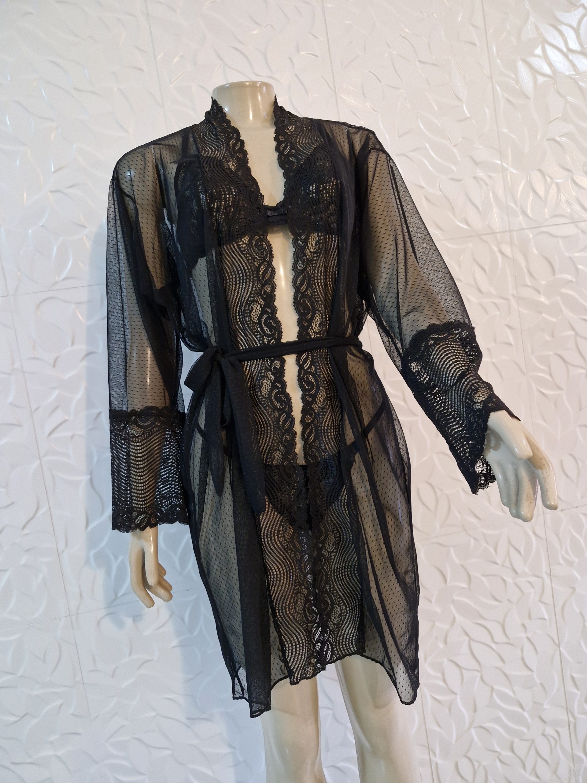 Esse robe é uma peça de roupa íntima pra usar sobre a lingerie ou em momentos especiais. A combinação de tule e renda resulta em uma peça que é ao mesmo tempo confortável e visualmente deslumbrante.